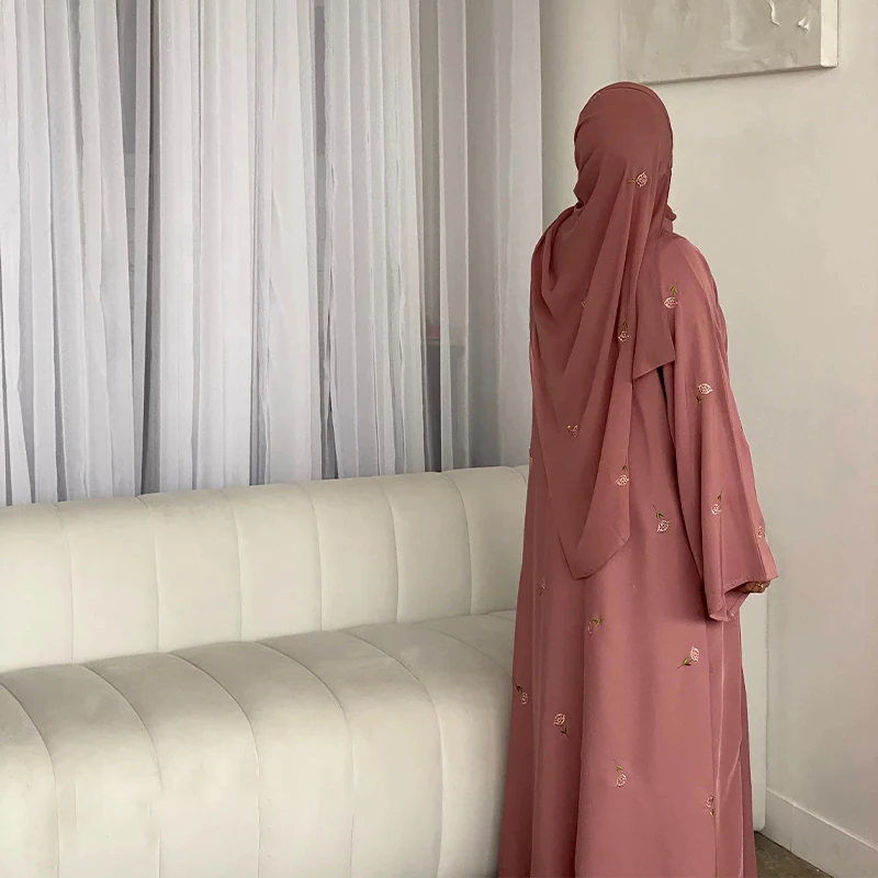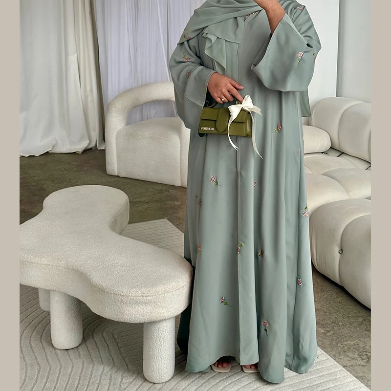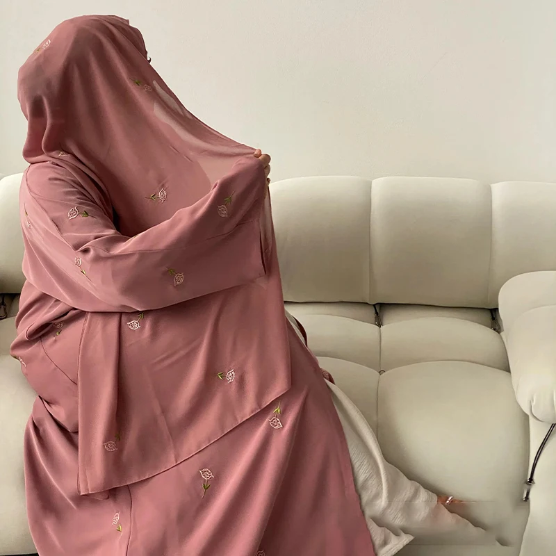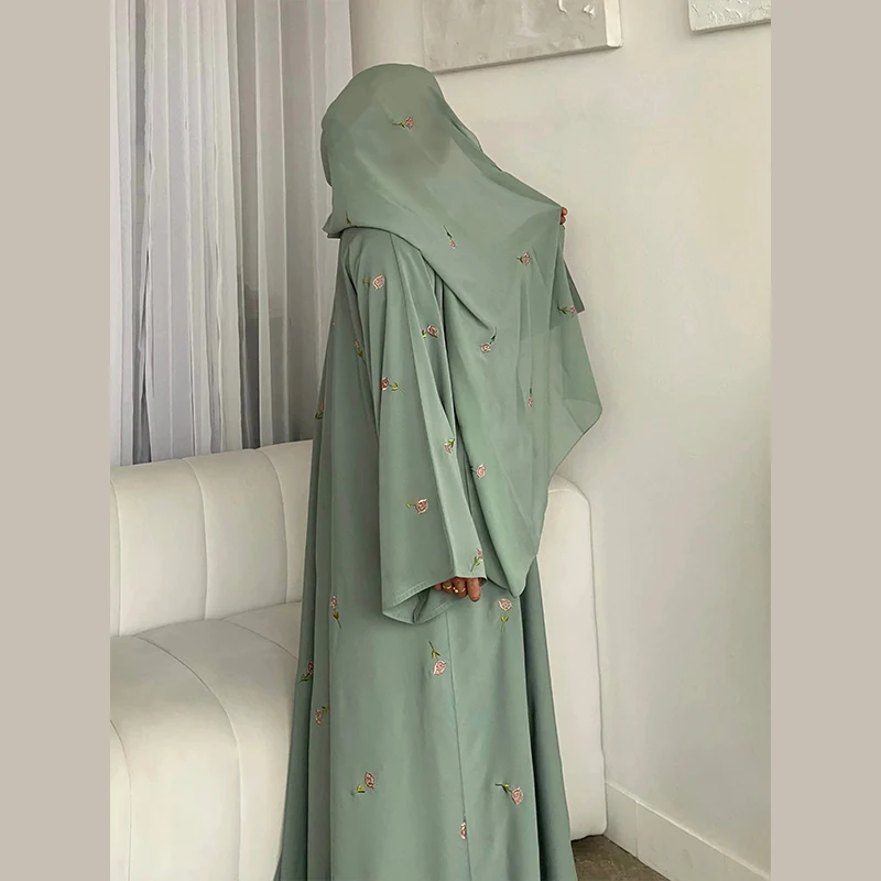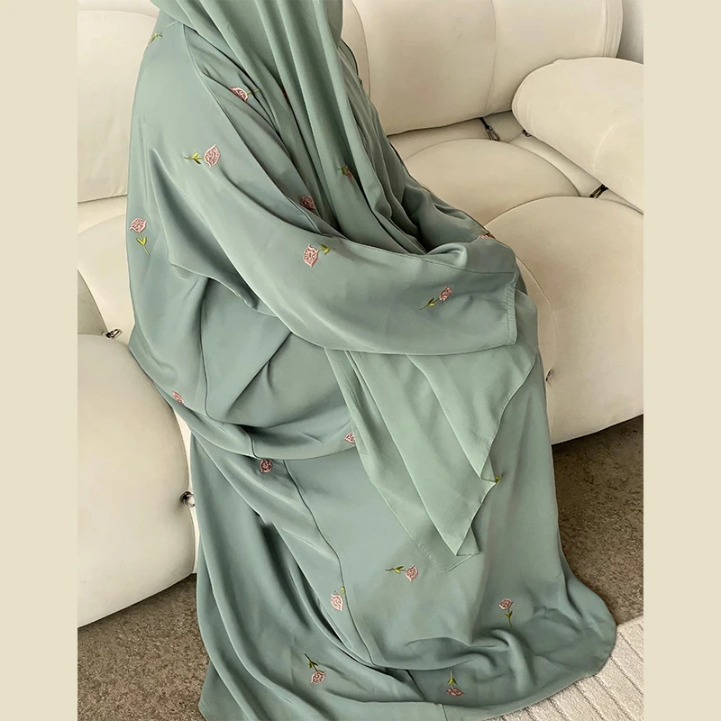 2025 Women Modest Abaya Dubai Chiffon Fabric Designs Flower Embroidery Muslim Open Abaya Hijab 2 Piece Set Islamic Clothing