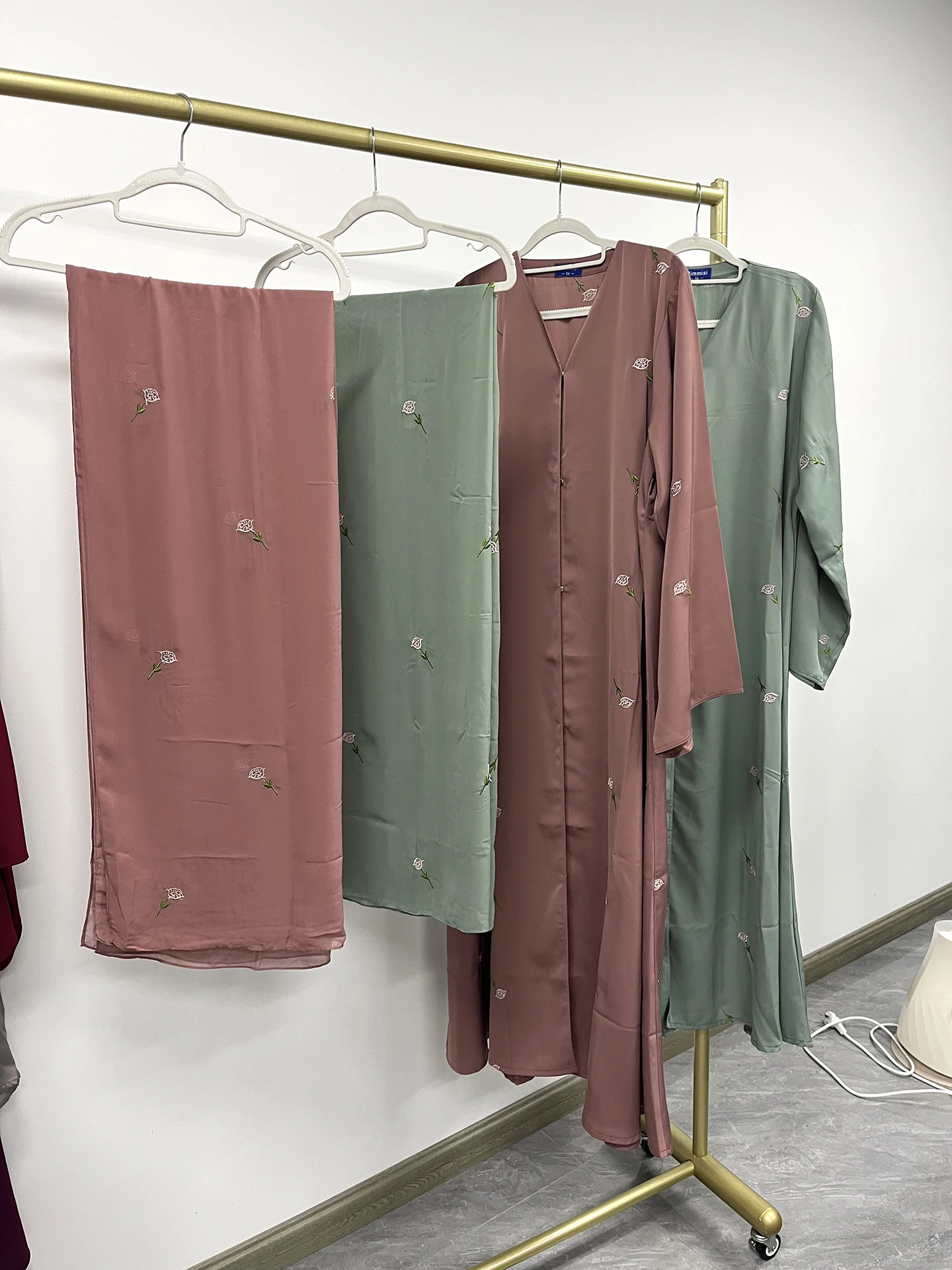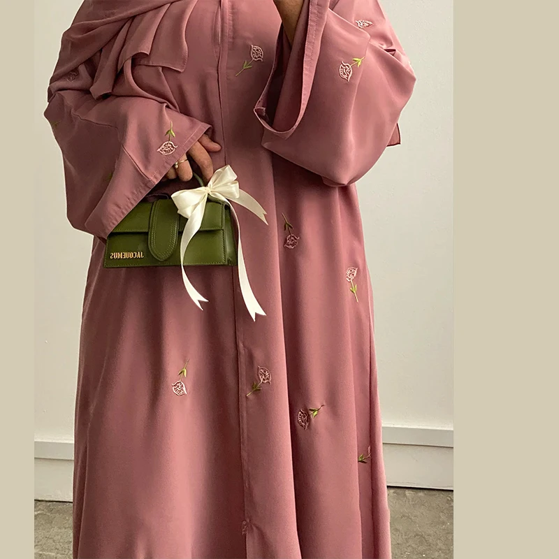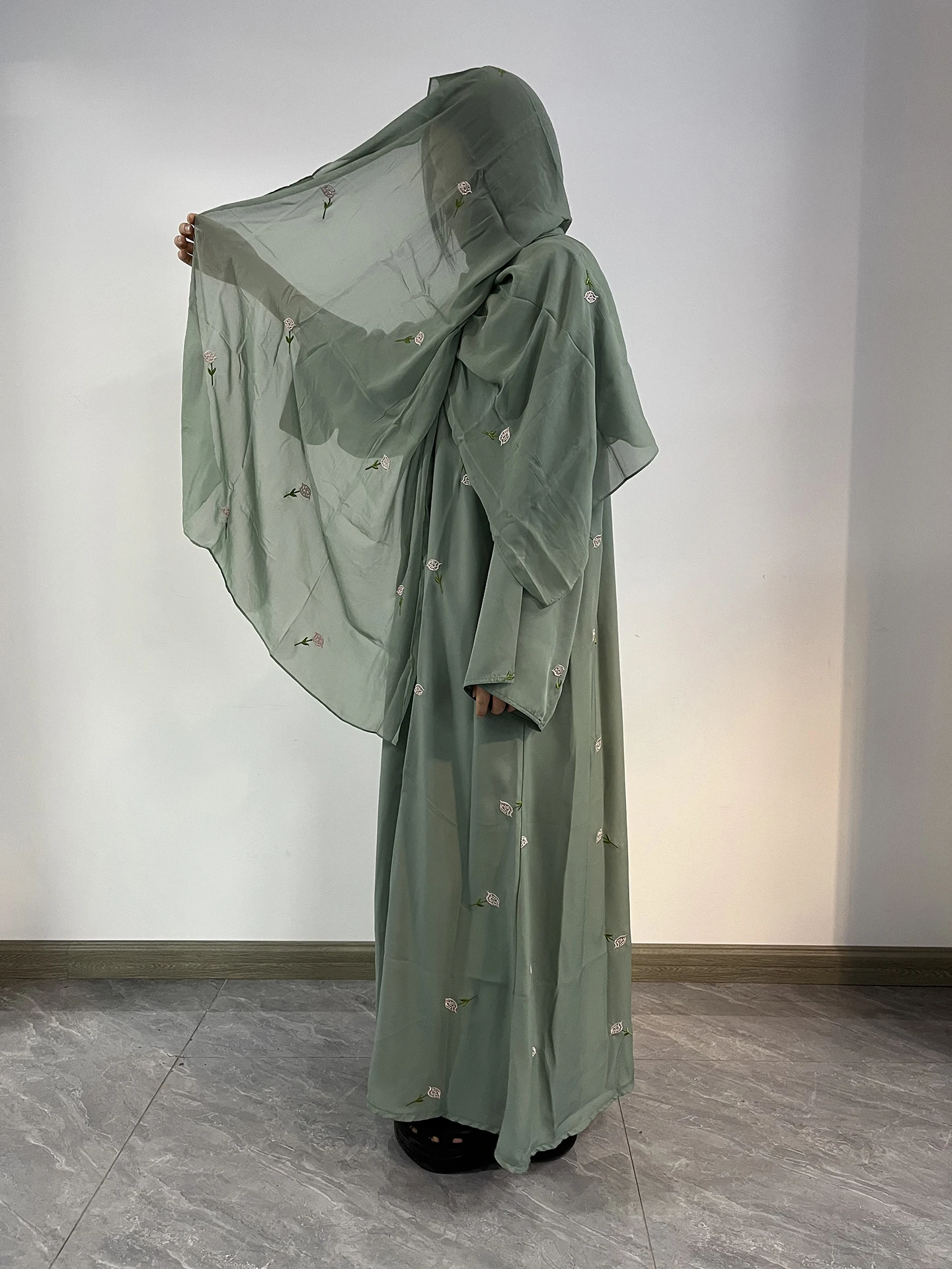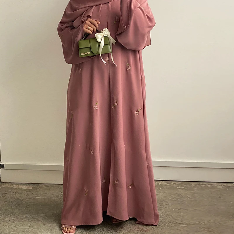 2025 Women Modest Abaya Dubai Chiffon Fabric Designs Flower Embroidery Muslim Open Abaya Hijab 2 Piece Set Islamic Clothing